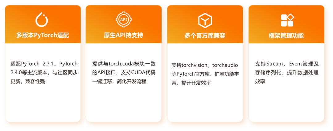 多版本PyTorch適配:適配多個(gè)PyTorch主流版本,如:PyTorch 2.7.1、PyTorch 2.4.0、PyTorch 2.0.1等,與社區(qū)同步更新,兼容性強(qiáng)。