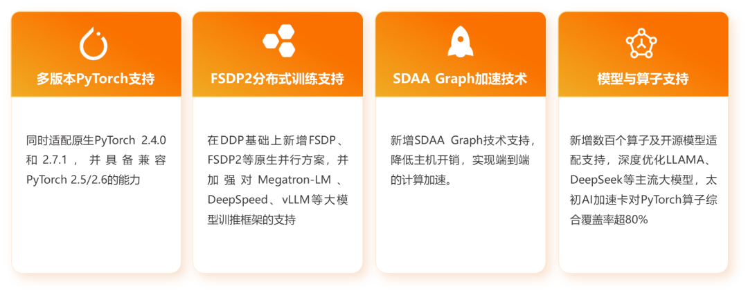 適配PyTorch 2.7.1,大幅增強(qiáng)算子和模型支持,強(qiáng)化torch compile、自定義算子擴(kuò)展與分布式訓(xùn)練(FSDP/FSDP2)等功能,兼容PyTorch 2.5/2.6。